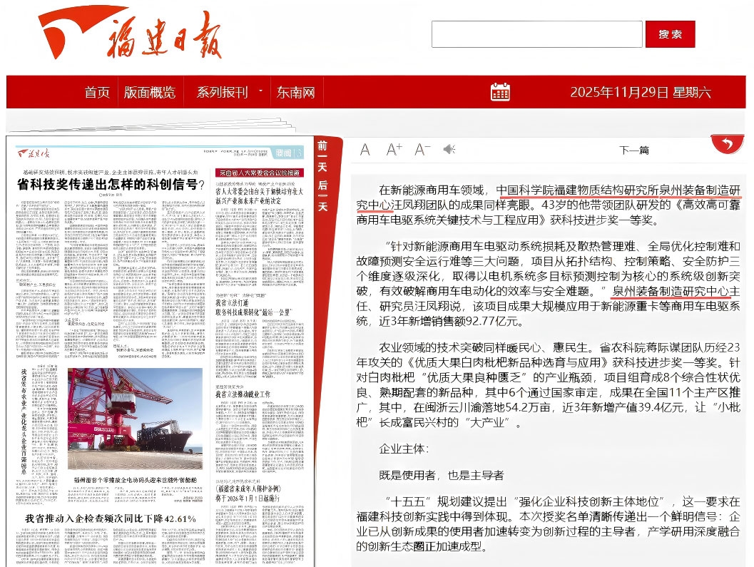 近日,福建省人民政府正式发布的《福建省人民政府关于2024年度省科学技术奖励的决定》(闽政文〔2025〕263号),泉州装备制造研究中心两项主持完成的成果荣获福建省科技进步奖,其中汪凤翔研究员主持完成的“高效高可靠商用车电驱系统关键技术与工程应用”荣获福建省科技进步奖一等奖,戴厚德研究员主持完成的“面向数智化柔性制造的智能物流关键技术及应用”荣获福建省科技进步奖三等奖。