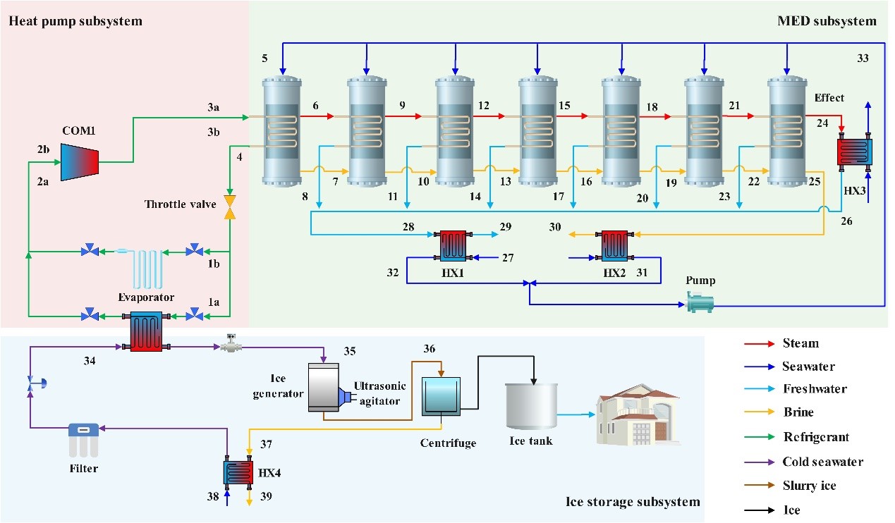 近期,中国科学院海西研究院泉州装备制造研究中心汪凤翔课题组陈龙祥团队针对低能耗的海水淡化技术与热泵系统的耦合展开了研究,提出了一种基于热泵的多效蒸发-冷冻淡化-冰蓄冷的耦合系统。该系统充分利用了热泵系统冷凝温度与多效蒸发淡化的首效蒸发温度接近的特点,热泵冷凝器用于多效蒸发淡化,同时蒸发器利用过冷水法制取流态冰,通过离心获得脱盐冰,并作为冷能存储介质按需为建筑供给冷量,融化后的冰获得额外淡水,实现能量的多级利用。这项研究成果已发表在 《Energy》期刊上("Thermodynamic and economic analysis of an integration system of multi-effect desalination (MED) with ice storage based on a heat pump" Energy 283 (2023) 129064)。陈龙祥副研究员是该论文的第一作者,通讯作者兰文超是中国科学院福建物构所与福州大学联培硕士生。